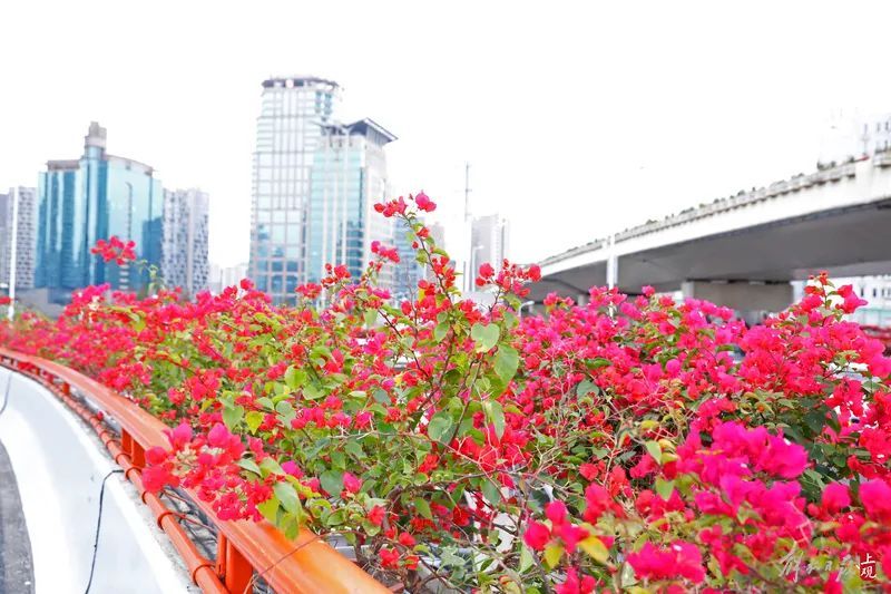 俯瞰高架路,红彤彤的三角梅为高架道路锁了花边。