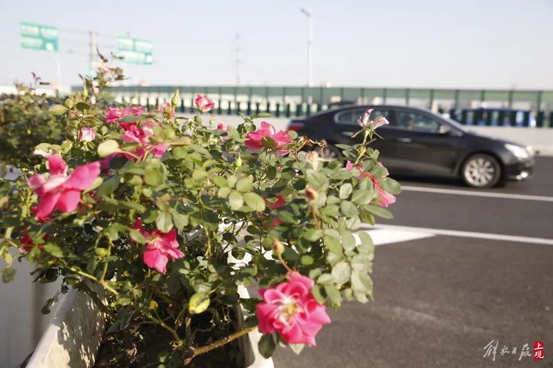 沪闵高架路梅陇立交段,粉色的月季花,营造出几许春光。