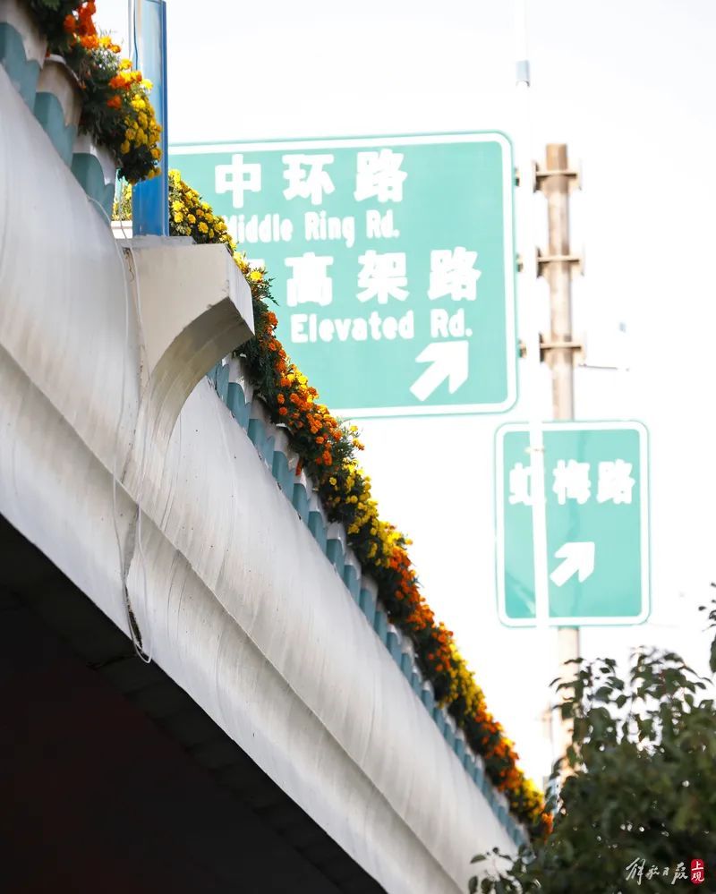 秋季的主要观赏花卉万寿菊,被大量用在沪闵高架路。