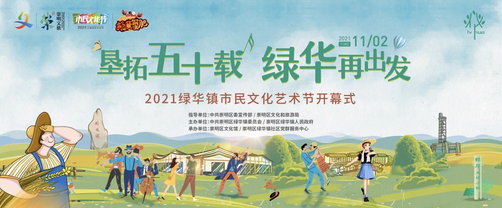2021年绿华镇市民文化艺术节以“垦拓五十载,绿华再出发”为主题,紧紧围绕建党百年、绿华围垦50周年,聚焦乡村振兴和绿华五大特色小镇建设等重点工作,将开展文艺巡演、书法摄影展、手绘红色地图、文艺团队展示等一系列活动,努力提升“绿华市民文化艺术节”的活动品质和品牌影响力。