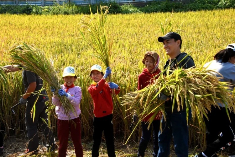 经验丰富的农民伯伯指导着孩子们,左手握住一束成熟的水稻,右手拿镰刀,下镰要准,收镰要快,从水稻的根部割稻,千万要小心,不要伤到手。很快孩子们都掌握了要领,开始热火朝天地劳作,现场一派欣欣向荣的活力。