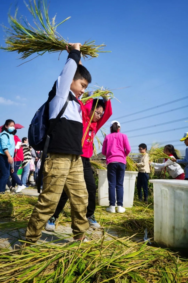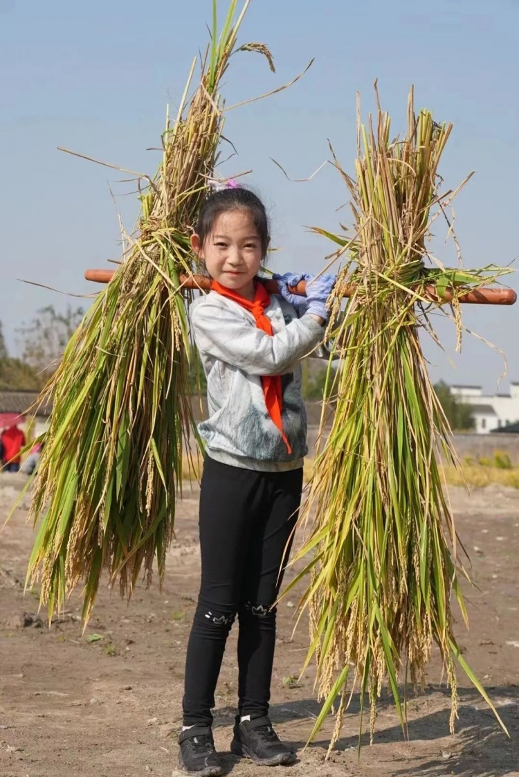 割完水稻,孩子们用稻草把稻穗扎成小捆,用小扁担挑着走在乡间的小路上,心里满是丰收的喜悦。随后,孩子们还参与了扎稻草人、打稻谷脱粒、挖红薯、做塌饼、喂小动物等活动。