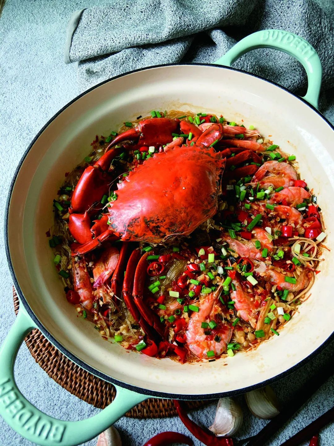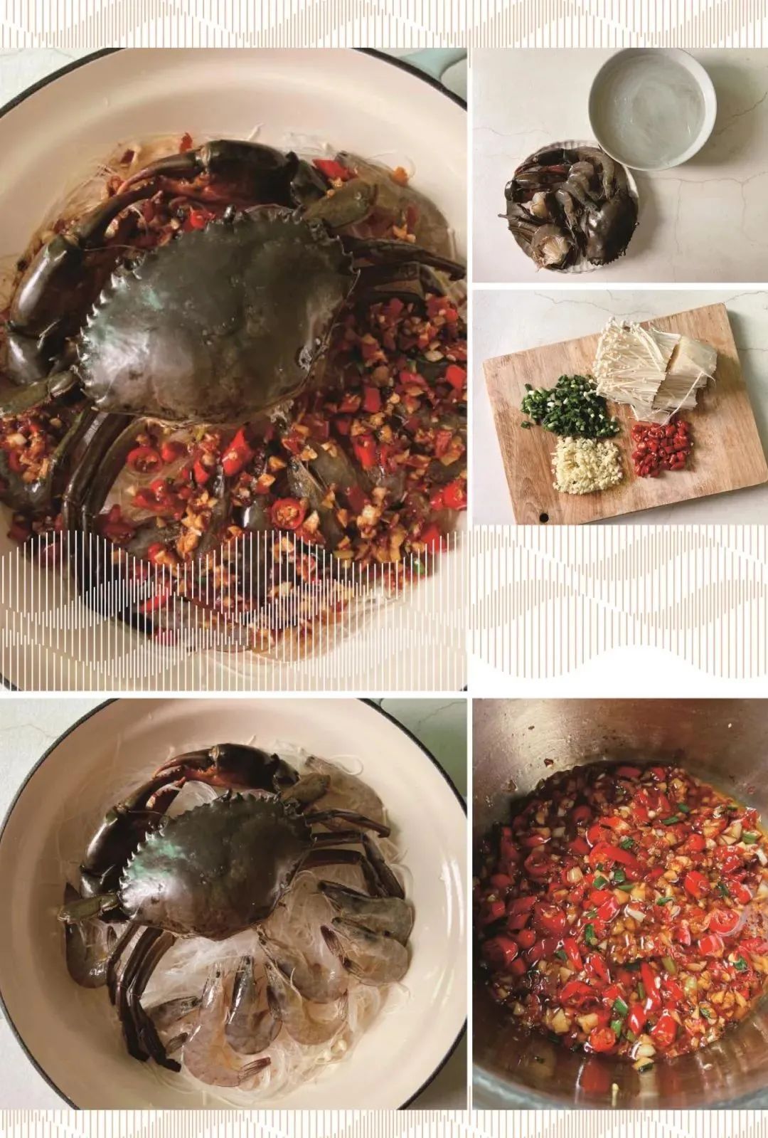 材料:膏蟹1只,鲜虾10只,绿豆粉丝2把,金针菇150克,蒜头6瓣,小葱2根,盐1/2小勺,生抽1大勺,辣椒酱2大勺,食用油2大勺,开水1小碗