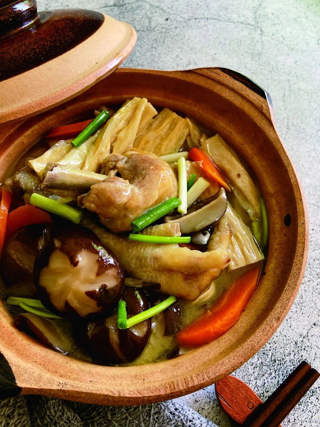 材料:鸡腿1只,干香菇6朵,胡萝卜2个,腐竹3根,生姜1块,盐1小勺,味精适量,淀粉1小勺,小葱1根,食用油1大勺