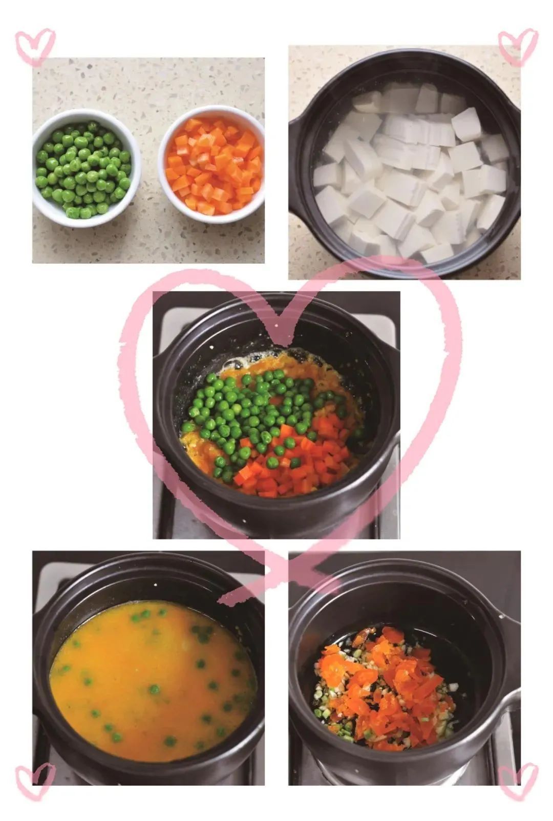 4、其中的豌豆和胡萝卜也可以换成其它个人喜欢的食材,如火腿丁,玉米粒等。