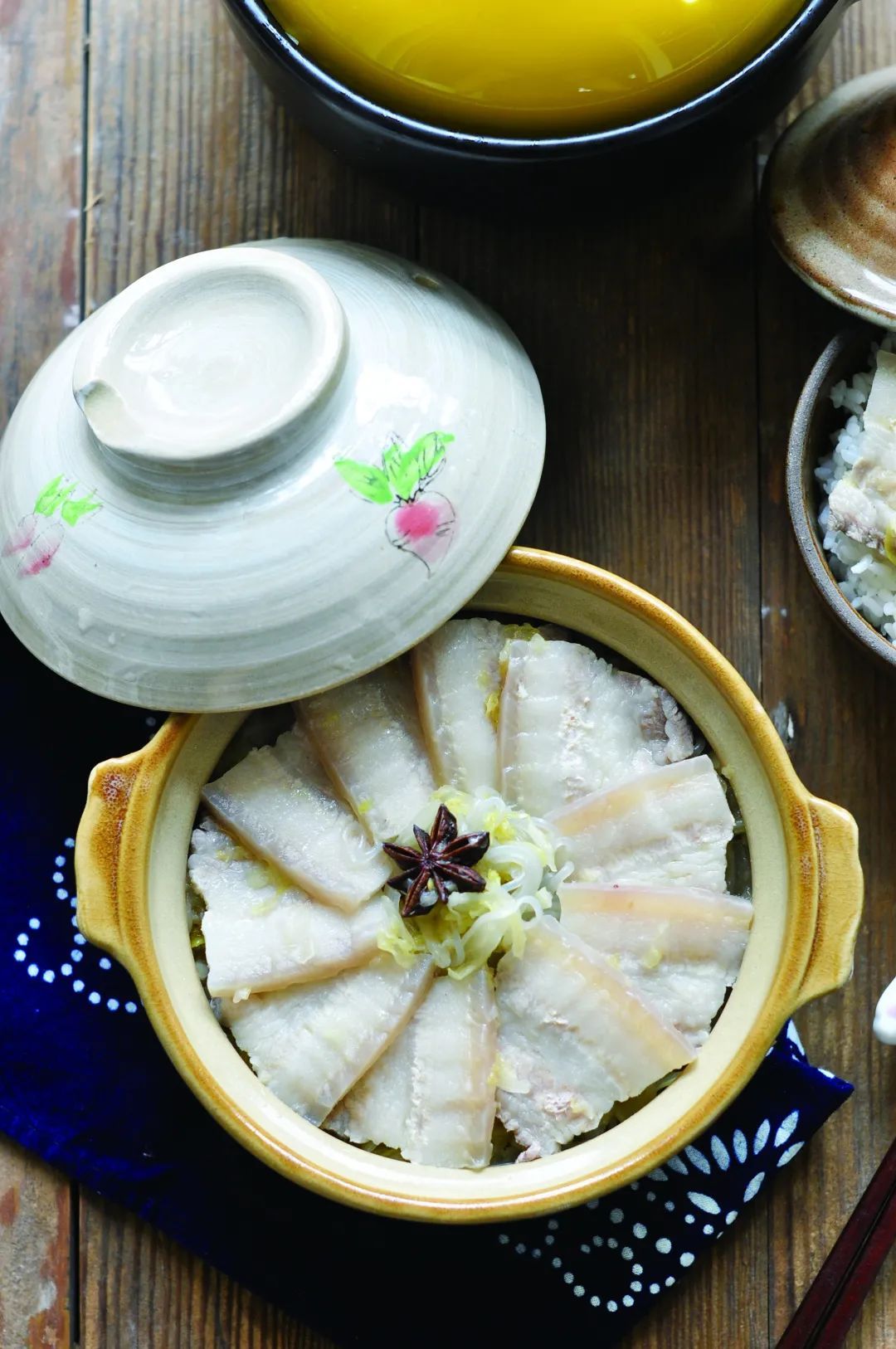 2、五花肉加入一半的姜、蒜、葱,并放入全部的花椒、八角,煮到筷子可以插入即可,晾凉并切片。肉汤滤净备用。