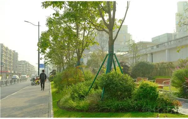 本次改造以“大气整洁、绚丽多彩”为目标,结合“四化”要求的相关(绿化、彩化、珍贵化、效益化),在人行道上,增加行道树数量,在部分区域种植了既可观花又可观叶的“七叶树”作为行道树,并将乔木、灌木、地被植物相结合,形成连续的绿带。