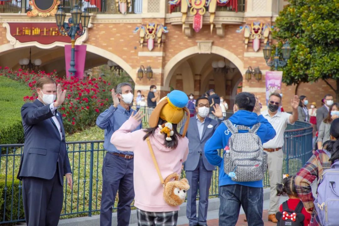 9时45分,迪士尼乐园比原计划提前了一刻钟开园。在距离入口处不远的米奇大街,乐园的管理人员和演职人员早已等候多时,向到来的每一名游客挥手致意,口中还不断问候:“早上好,欢迎来到迪士尼,欢迎回家。”