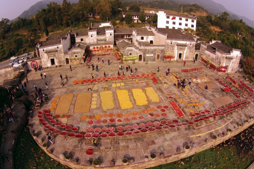 呈坎村至今完整保存着东汉三国时期三街九十九巷的古村落肌理,以及明、清等历代古建筑、古遗址180多处。朱熹曾用“呈坎双贤里、江南第一村”来形容呈坎。“晒秋”是皖南地区普遍存在的生活习俗。每年秋季,村民们都会将刚收获的农作物晾晒在村中的晒场上,或者房前屋后的晒架上。呈坎晒秋的习俗已经延续了数百年,村民将五颜六色的果实拼出丰富的图案和字样。生动的晒秋场景,成为秋天里一道美丽的风景线。