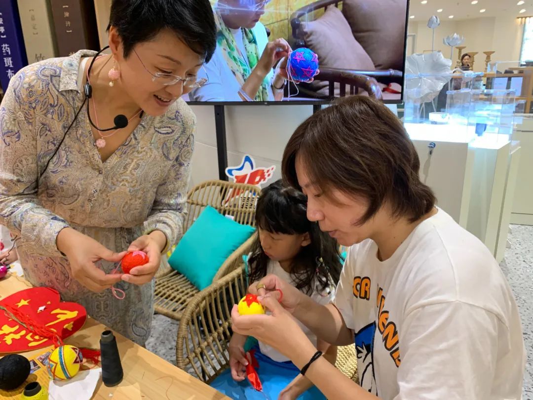 本次活动配置成型球心、手鞠尺、定位针和颜色各异的丝线,利用工具从球心进行分球,再挑锈上美丽的图案。做好的手鞠球作为象征好运与幸福的礼物,自用或是赠与亲朋好友都十分合适。