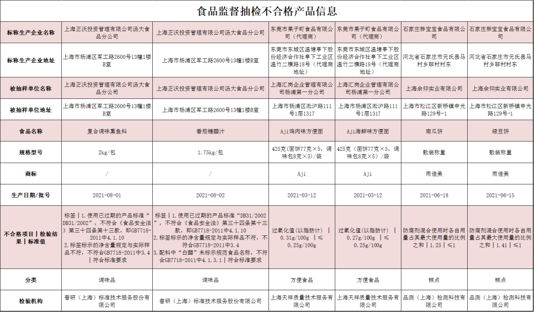 1.上海正沃投资管理有限公司汤大食品分公司生产并销售的复合调味熏鱼料(不合格项目:标签);