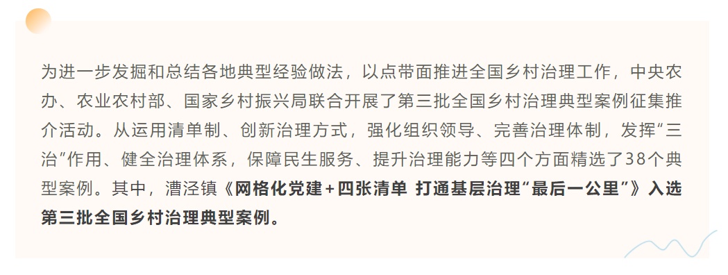 自“网格化党建+四张清单”做法推行以来,漕泾镇发挥“清单”优势,抓住“制度、责任、行动”三个关键要素,形成合纵连横、闭环协同的基层网格化党建工作体系,始终以“百米冲刺”的精神领跑联系服务群众的“最后一公里”,在基层治理中凸显可持续性与可推广性的显著优势,为创新基层治理提供新路径。