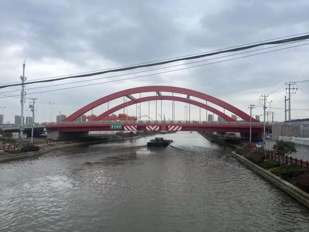 值得一提的是,景洪路跨春申塘的大桥,桥梁为钢箱梁式,远远看去宛若一道“飞虹”。据了解,前期在南侧引桥段完成拼装,再采用整体顶推工艺将整个桥梁顶推至对岸,这在城市桥梁建设当中是少见的。