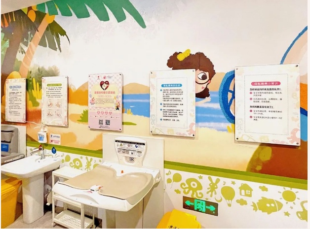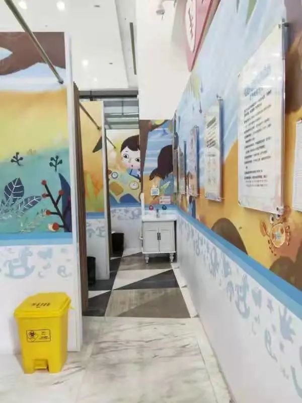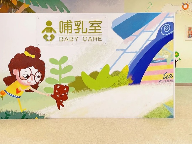 哺乳室分别位于门诊的1至3层,走进大厅就能被这一方温馨的天地吸引。哺乳室外观融入了儿童友好理念,插画色彩鲜艳,富有童趣和温馨色彩。