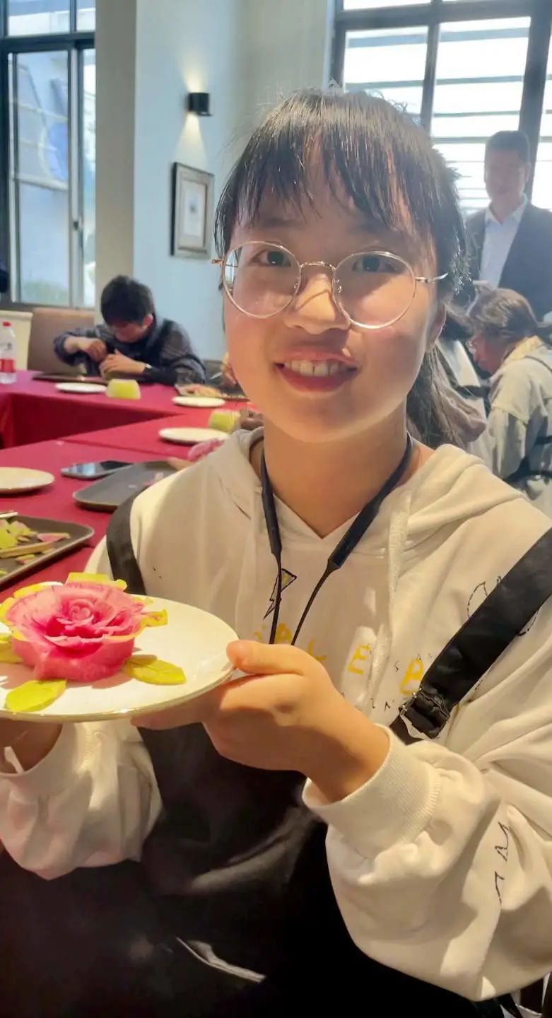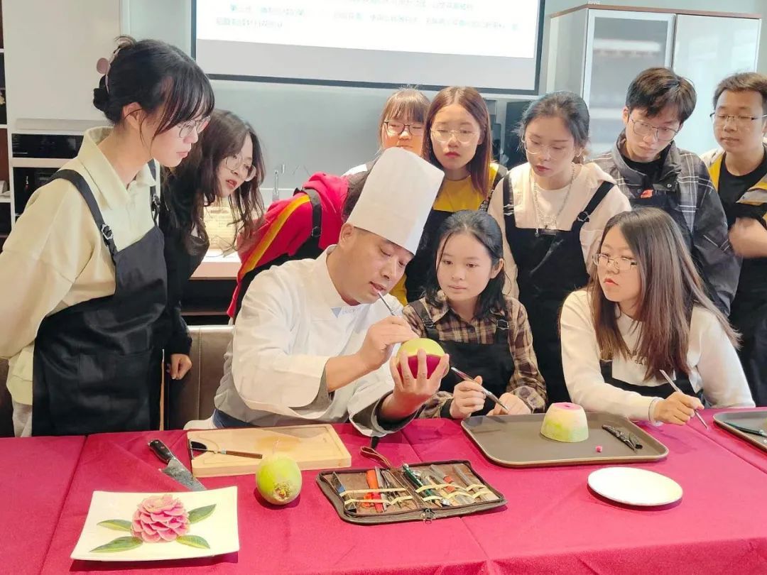 第二堂课的内容是冷盘雕刻——富贵牡丹花。课程为大家介绍了食品雕刻的起源、形式、类型以及表现方法,然后通过分步演示,详细讲解了运刀、制胚、雕刻等技巧和注意要点,指导同学们如何将一颗普通的萝卜雕刻成为造型花的全过程,让同学们在生活中发现美、培养审美观。