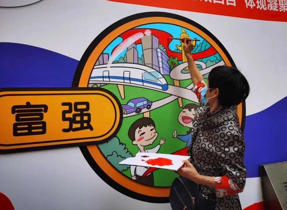 彩绘墙上,“富强”“民主”等12个关键词,均对应一幅用圆圈圈起来的漫画,串联起12幅漫画的是一条“蓝色秀带”,象征着中国文化渊远流长。彩绘墙的上下方特意用了明亮的红色、橙色、蓝色、绿色等颜色,远远望去就像一道“彩虹”,让老弄堂的围墙成为居民眼里一道亮丽的风景。