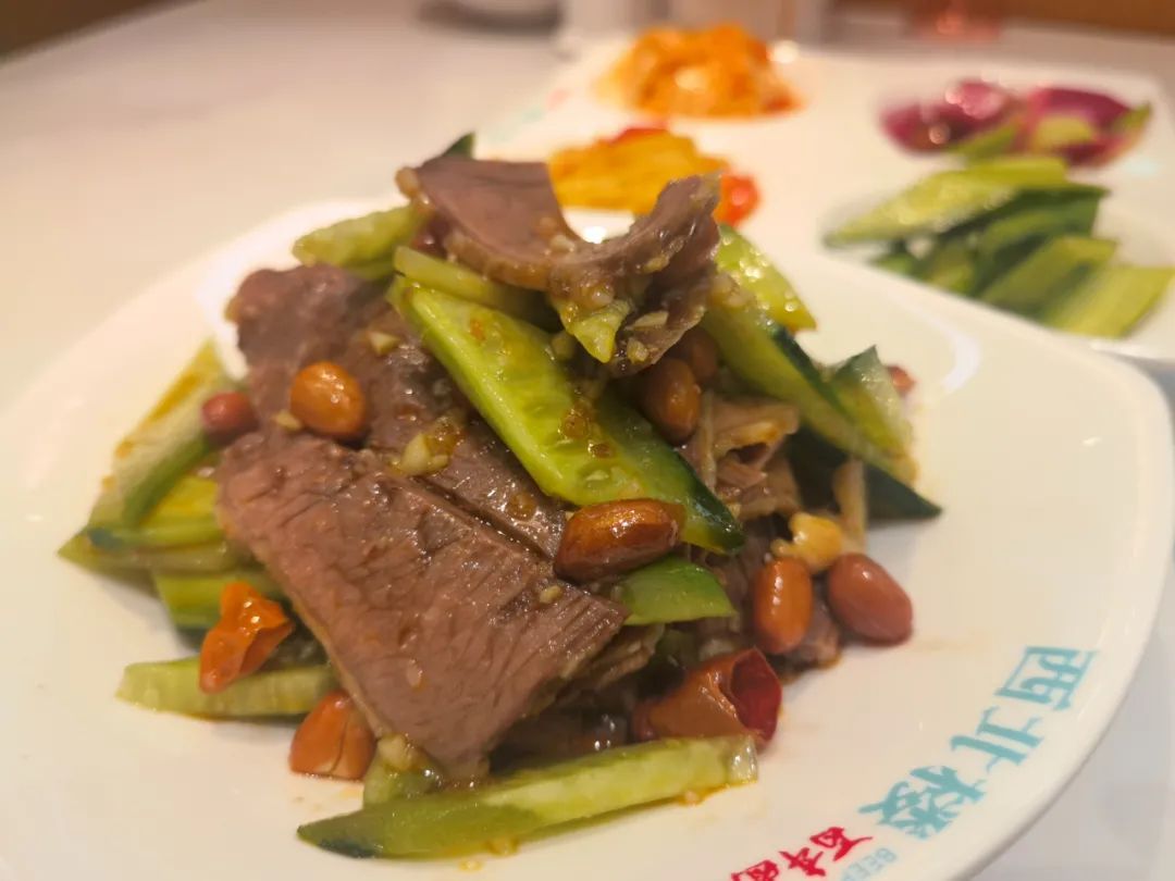 除了牛肉面,来到西北楼,必点的还有一份茶卡手抓羊肉,选自高原生态羊肉,没有丝毫羊膻味。羊肉整整一盘分量感满满,肉质十分紧实,配上佐料,一口下去唇齿留香。