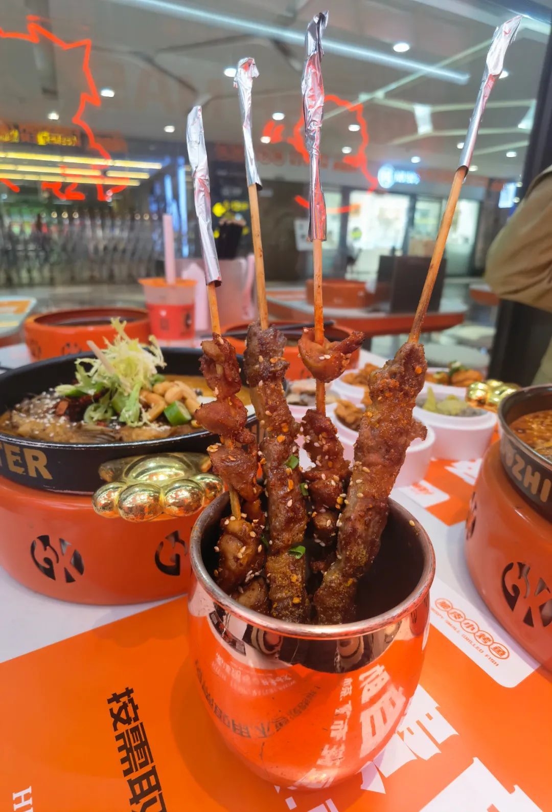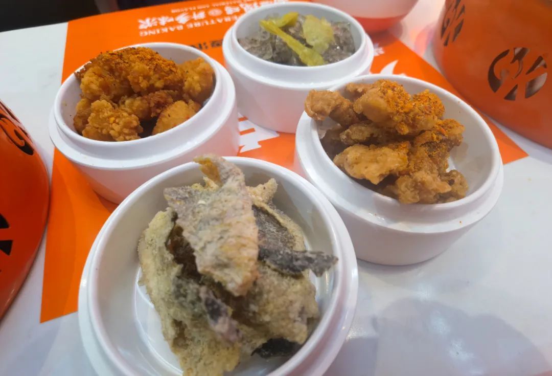 让人大快朵颐的不止烤鱼和蹄花饭,还有秘制烤串。两肥三瘦的羊肉串、个大弹牙的烤鸡胗、香脆入味的烤掌中宝,经过300度爆烤后,配上秘制香料和撒料,香味扑鼻,串串美味。