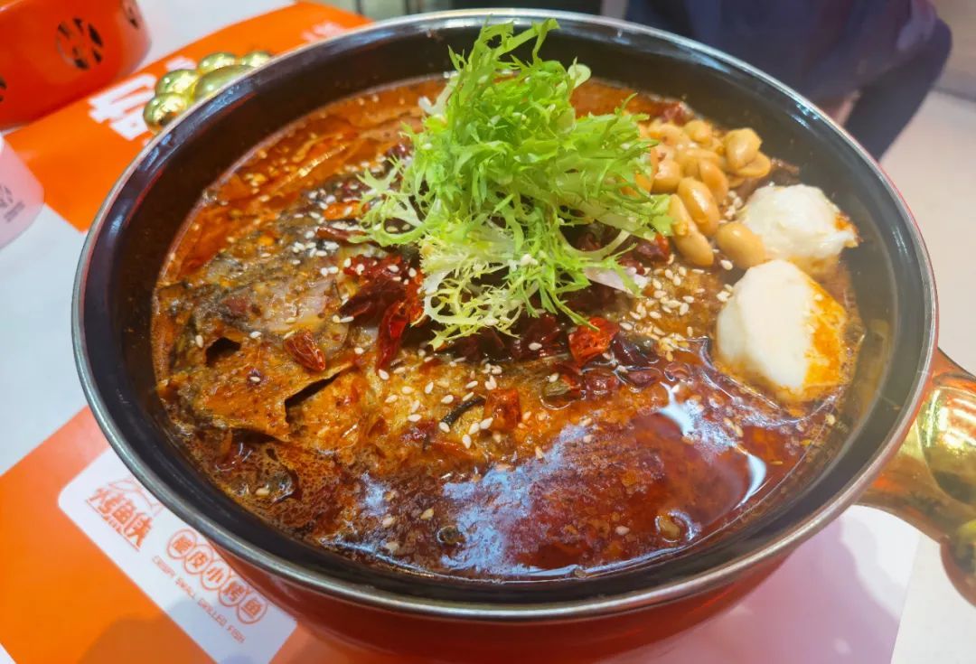 店内的烤鱼现点现烤,选用的是罗非鱼,经过260度以上的猛火烤和精火烤后外酥里嫩。3位川渝调味大师合作研发的炒料,让烤鱼的口感层次更有料。