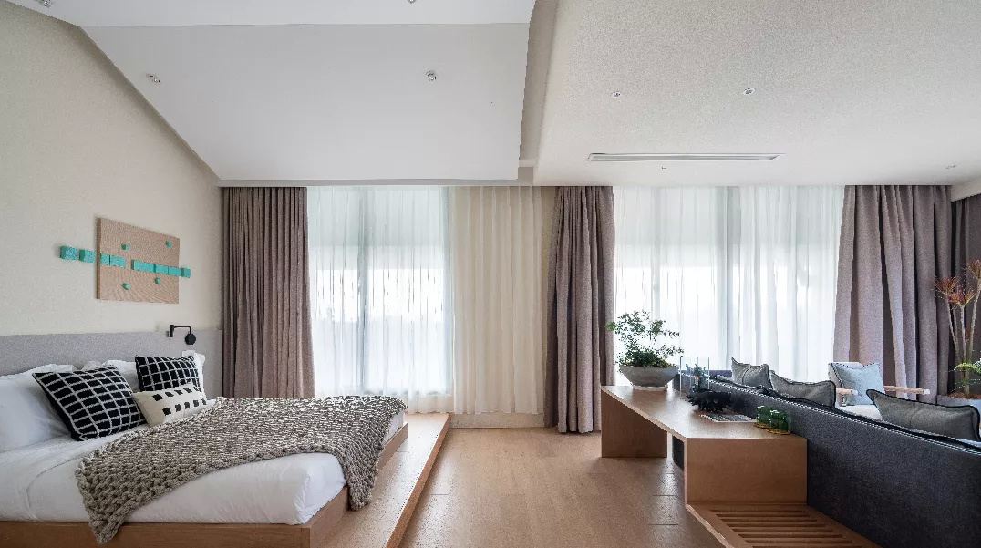 「非酷不住」新FUN潮宿共两栋,八间客房。在设计上融入Cool的潮流元素,丰富的色彩搭配、大胆前卫的设计风格,传递着年轻创新与活力,将水库村最美的自然风光尽收眼底。