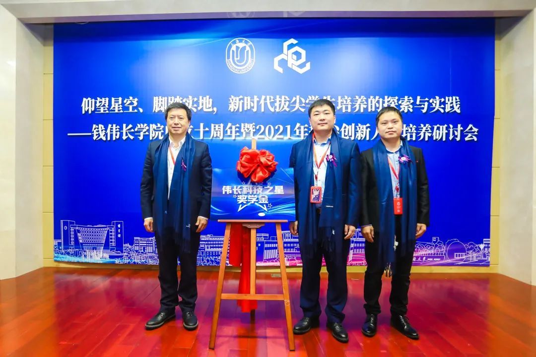 刘昌胜校长与钱伟长学院2009级校友、上海摇橹仪器设备有限公司总经理陈杨,副总经理、技术总监沈兵一起为“伟长科技之星奖学金”揭牌。