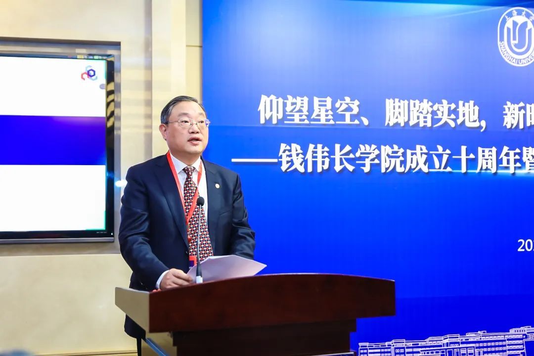 大会现场,成旦红书记代表学校向钱伟长学院成立十周年表达了热烈的祝贺,向为学校教育教学改革和拔尖学生培养做出重要贡献的钱伟长学院历任老领导、全体师生员工以及关心和支持学院发展的各界人士表达了衷心的感谢。成旦红回顾了钱伟长学院的发展历程,高度肯定了学院近年来在拔尖创新人才培养上形成的有效路径和实践经验,希望钱伟长学院以此次成立十周年为新的起点,牢记改革试点学院的重要责任和使命,聚焦国家战略和上海发展重大需求,锐意改革,积极进取,在基础学科拔尖人才培养方面持续探索,培养更多具有家国情怀、人文修养、世界胸怀和“伟长特质”的拔尖创新人才,造就一批未来的学术领军人物。