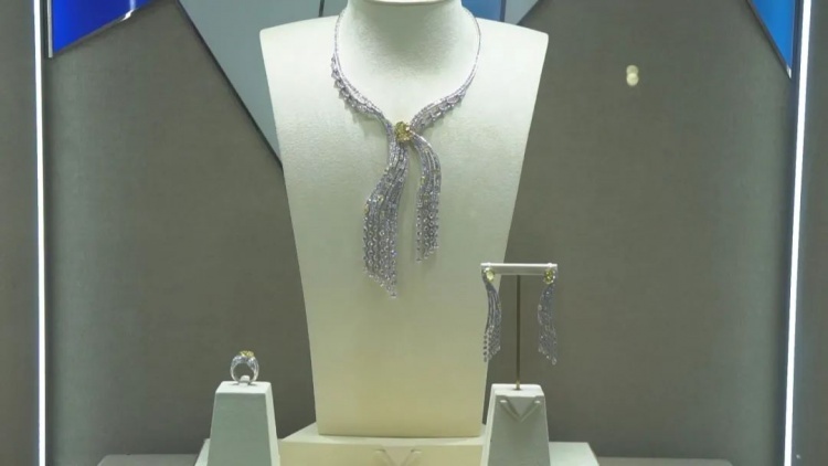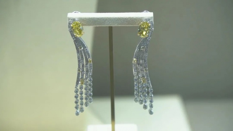 史莎莎告诉记者:“这套高级珠宝我们也在跟很多国际头部拍卖行合作,它的起拍价格是1.18亿元人民币,你可以看到整个流线弧线都非常灵动,我们找到四颗最高品质、大小统一的黄钻宝石,花了三四年时间才呈现这样一套高级珠宝作品。”