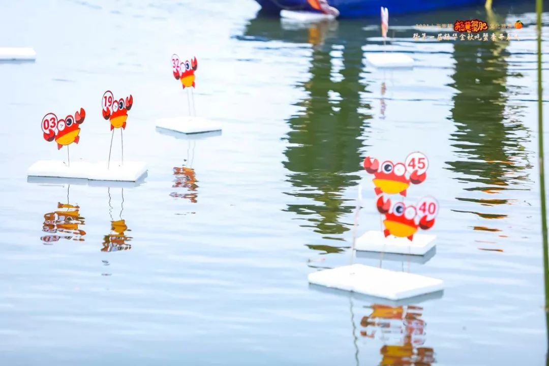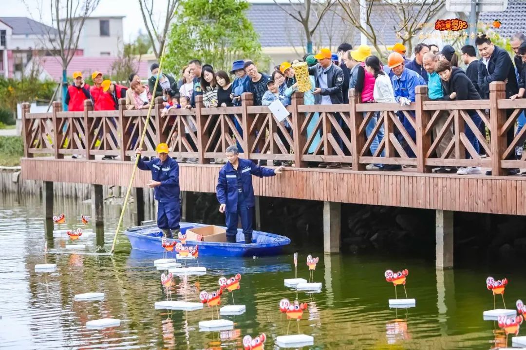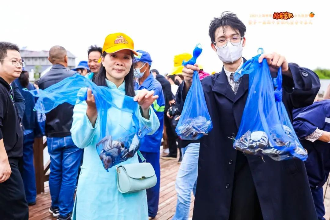 游客们还能抽到“蟹”盲盒。活动现场,湖面设置数字彩色漂浮球,每个漂浮球下都有一笼数量不等的崇明清水蟹,通过抖音直播的方式,向游客和观众进行盲盒销售,每个蟹盲盒售价统一,根据观众下单的漂浮球数字,现场开船捕捞、清点数量并打包快递。“看,我抽到的这笼蟹真不错!”抽到盲盒的游客骄傲地挥动手中的奖品。