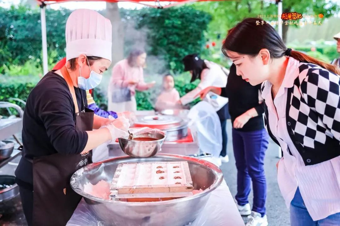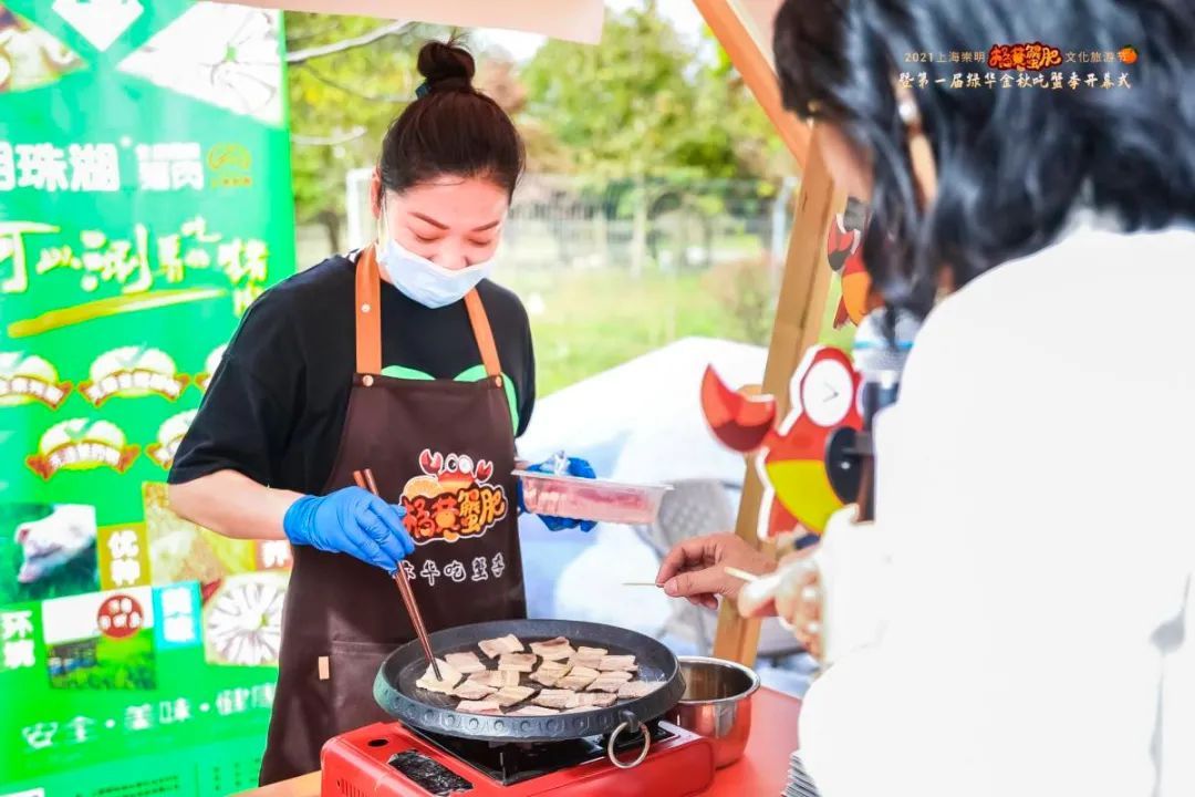 不止有蟹,崇明大米、绿华橘子、明珠湖猪肉……一大批崇明优质农产品现场设摊售卖,供游客选购。主办方还邀请印糕制作师傅,带领游客亲手制作与蟹相关的印糕或西点,如蟹粉印糕等,好吃又好玩,可作为伴手礼。