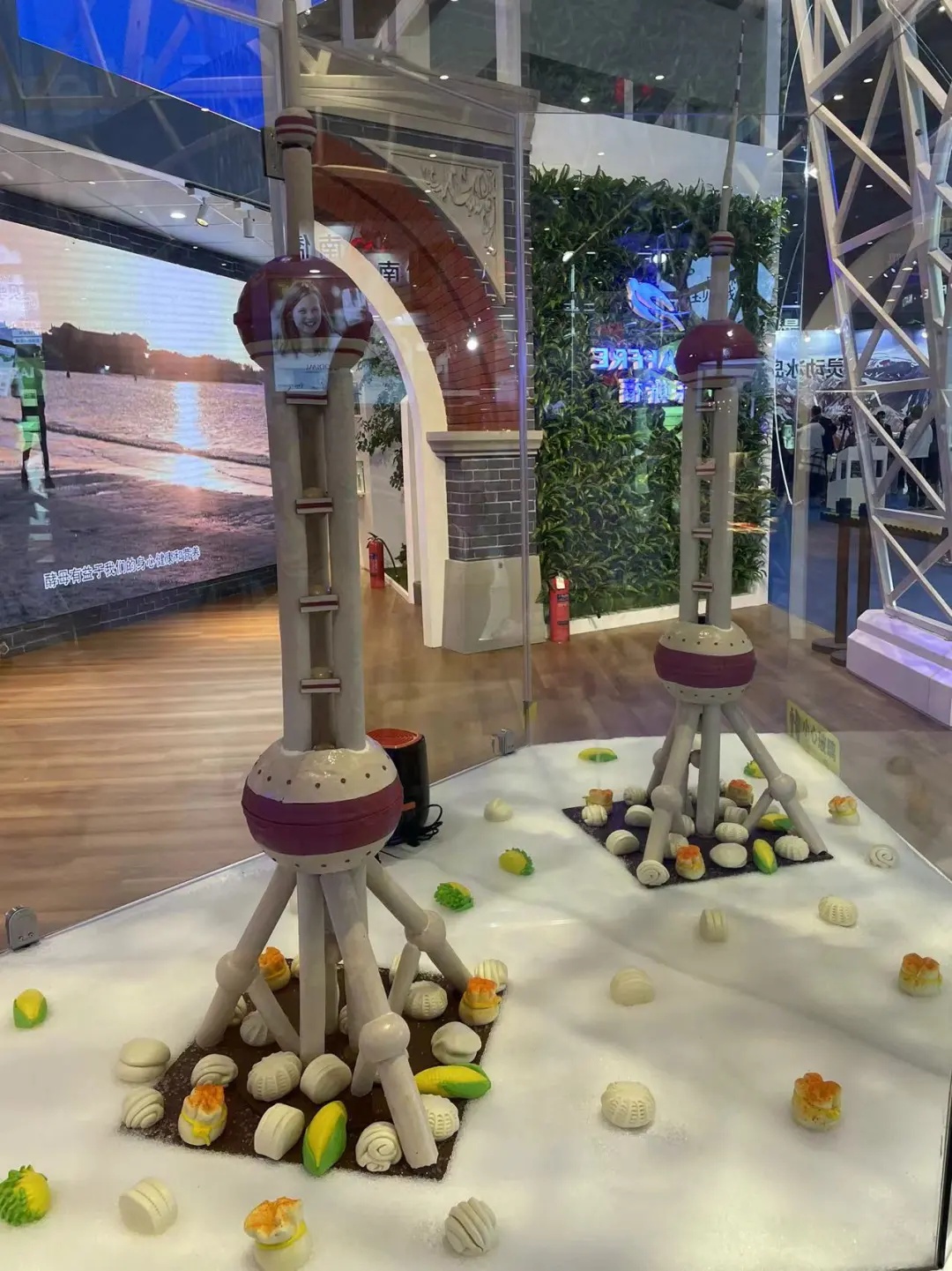 如何想到这种设计方式?乐斯福燕子培训中心经理王莉告诉记者:“我们是一个法国公司,我们就选择了埃菲尔铁塔建筑,下面铺的是面包,然后中国我们就选择东方明珠建筑,下面铺的是包子馒头,一种中西文化的结合作为这次设计的来源。”