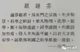 顾诵芬院士是上海市南洋模范中学1947届校友。在校友毕业纪念册上,同学为顾诵芬院士写下了这样一段话“诵芬顾君,为吴门之望族。年少敏慧,科学之研讨,举凡物理、化学、数学,无不领悟透彻,同学请问,均能详加指导。待人尤和蔼可亲,以君天才与好学,诚能为我国之科学界放一异彩”