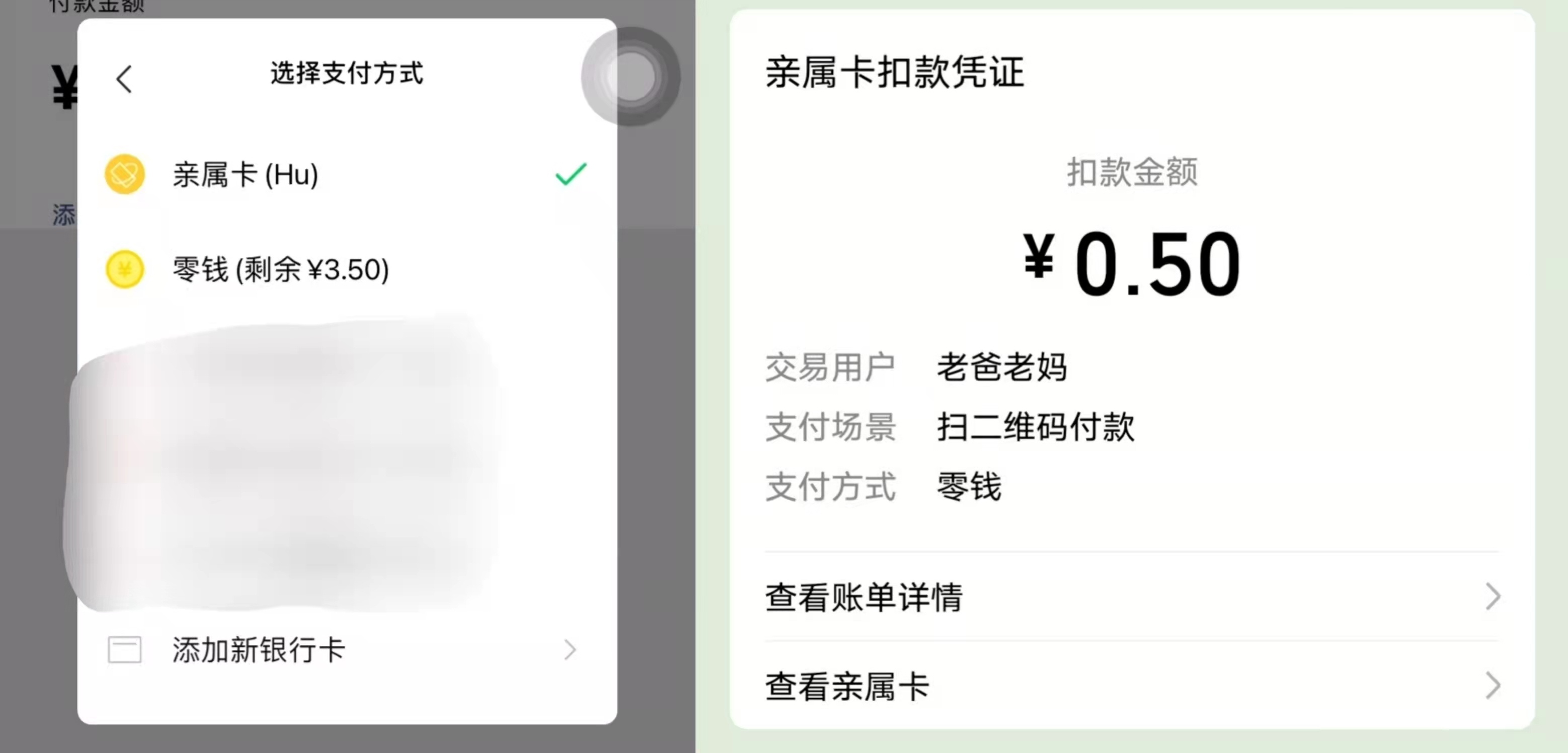 消费时支付方式默认选择亲属卡,这样将从赠卡人账户扣款,消费信息一目了然。