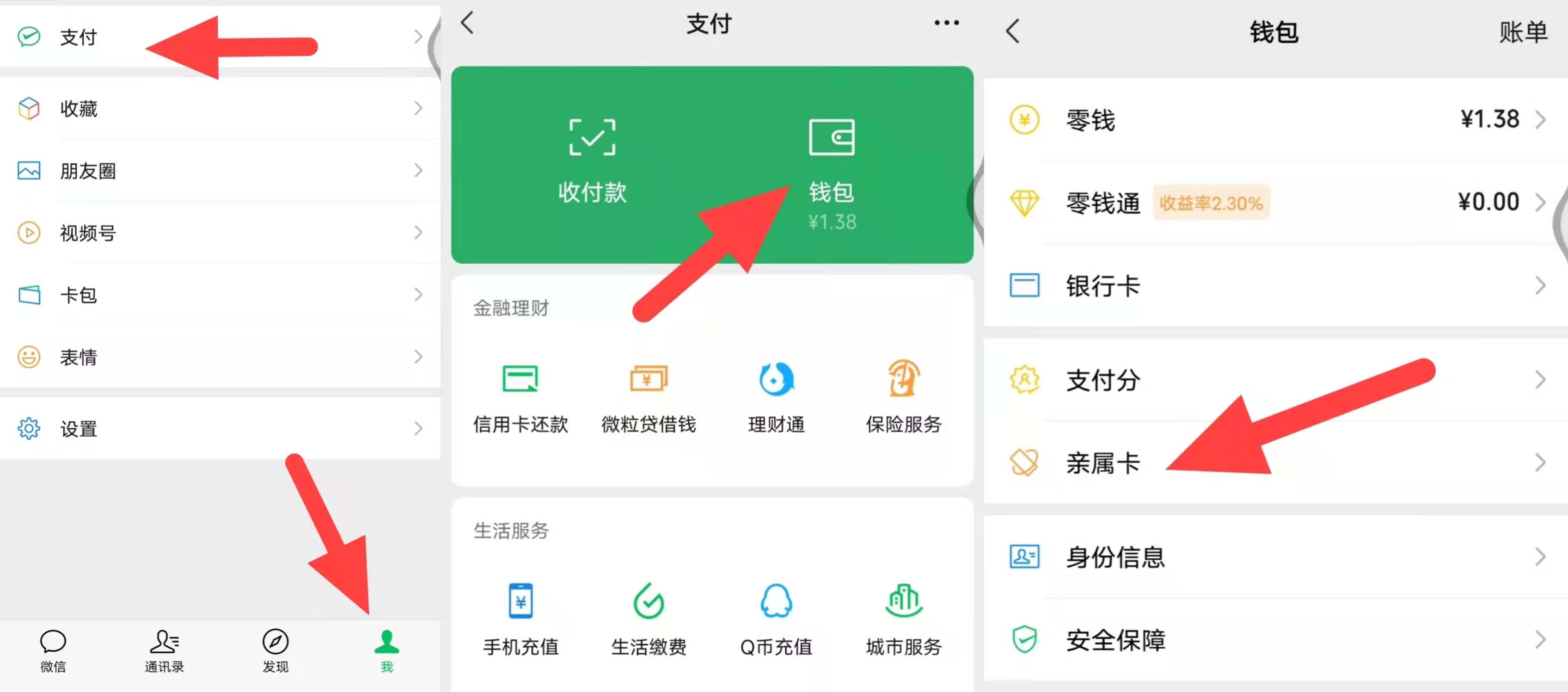 记者体验了设置过程:首先在“我”中选择“支付”,再点击“钱包” 选择“亲属卡”,选择一个亲属关系。