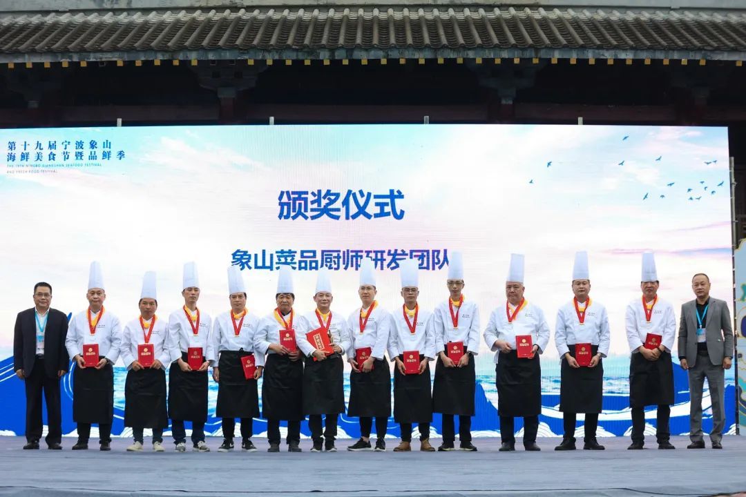 宁波市餐饮业和烹饪协会会长郭海浩先生、象山县商务局局长干焊先生上台为象山菜品厨师研发团队颁奖。