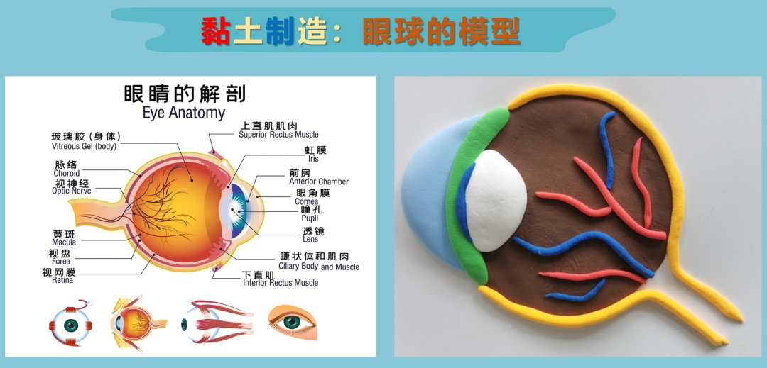 小朋友们根据眼睛的解剖示意图,一边学习眼睛的构造,一边用彩色黏土进行制作,并认真地用标签在眼球的各个部分旁进行标注。