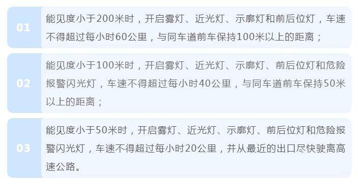 第八十一条规定,机动车在高速公路上行驶,遇有雾、雨、雪、沙尘、冰雹等低能见度气象条件时,应当遵守下列规定: