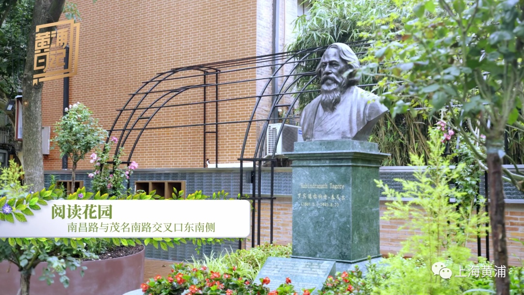 阅读花园与书店联合共建,通过汀步园路、阅读廊架、琉璃书墙,休憩空间,打造小巧而精致的阅读空间,抬高的花坛与泰戈尔雕塑相称。