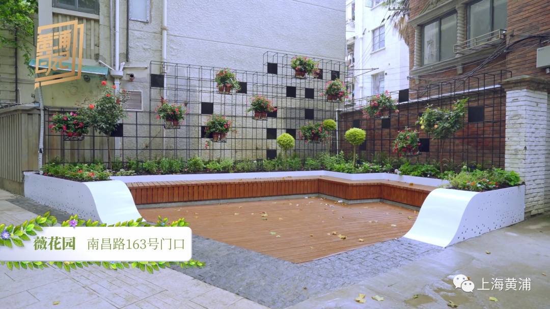 薇花园因地制宜,布置耐荫花卉,在建筑墙体间增加花架嵌体与木质坐凳,并且通过社区居民参与绿植认养,实现共治共享。