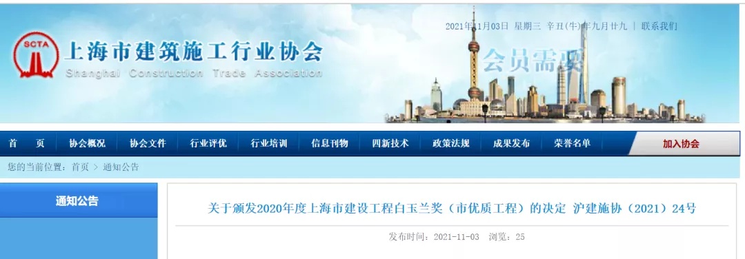 近日,上海市建筑施工行业协会发布《关于颁发2020年度上海市建设工程白玉兰奖(市优质工程)的决定 沪建施协(2021)24号》,共有131个工程获奖,其中来自奉贤区的5个。来看具体名单↓
