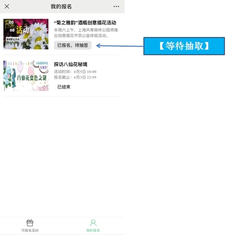 提交成功后可在我的报名中查看报名状态,报名截止后会在后台进行随机抽取,抽中显示报名成功,未抽中则显示未抽中。