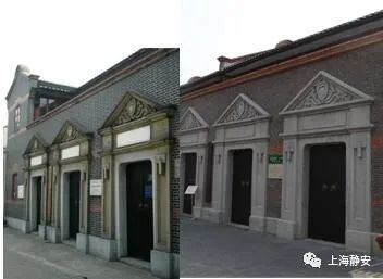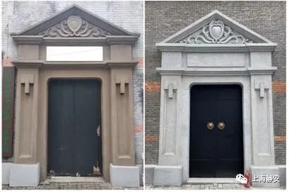 经过手工放样、用料配比、色泽调试、检查复核等工序恢复了5座石库门上的水刷石雕花装饰,并清洗打磨、修复了原有石库门框水刷石饰面,对破损的石库木门及圆形铁质门环进行了修复,还原了历史原貌……