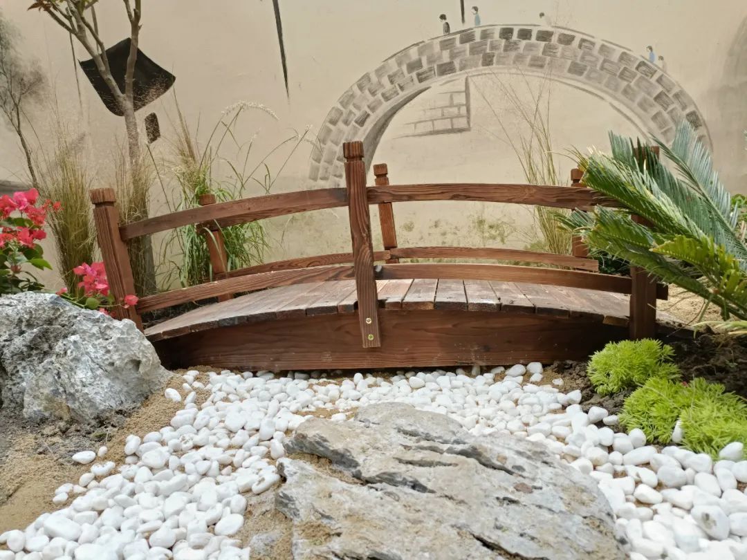 “泽水而居、向阳而生”主题小花园选用生千屈菜,鼠尾草,细叶针芒,粉黛乱子草,红穗狼尾草,茶花,绣球花等草花植物,搭配木桥、水井、旱溪、山石,营造出美丽的江南风景。