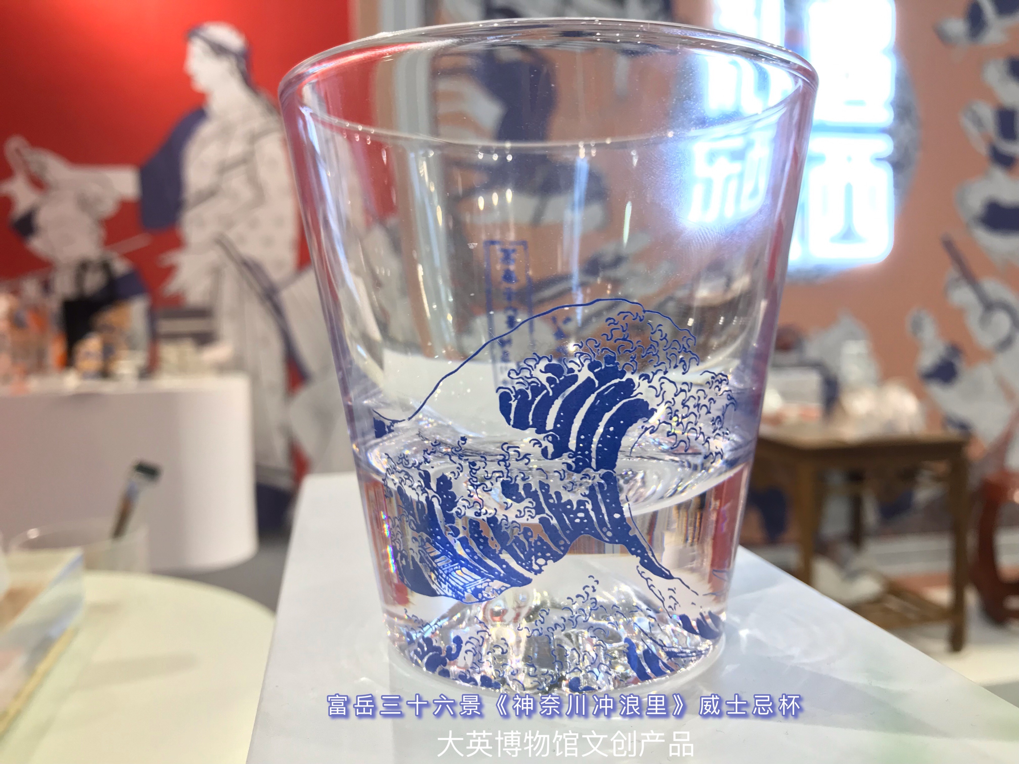 除了食品,文化艺术类展区里也有很多既好看又有内涵的展品。比如,来自大英博物馆的富岳三十六景之《神奈川冲浪里》威士忌杯就很有特色,《神奈川冲浪里》是日本画家葛饰北斋于19世纪初创作的一幅彩色浮世绘版画作品。该画描绘的是神奈川附近海域汹涌澎湃的海浪,浪里有三艘奋进的船只,英勇的船工们正为了生存而与大自然搏斗,表达了人们乘风破浪、勇往直前的大无畏精神。这款酒杯不仅复刻了原作的画面,还精准地还原了“北斋蓝”的经典蓝色,更巧妙地是,杯底的凸起部分正好做成了原作中富士山的样貌,让整个杯子神形兼备。除此之外,由上海博物馆和纽约大都会博物馆联名打造的“礼遇东西”主题展里也有不少精美展品。