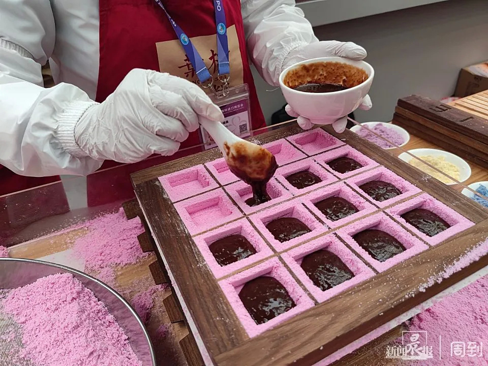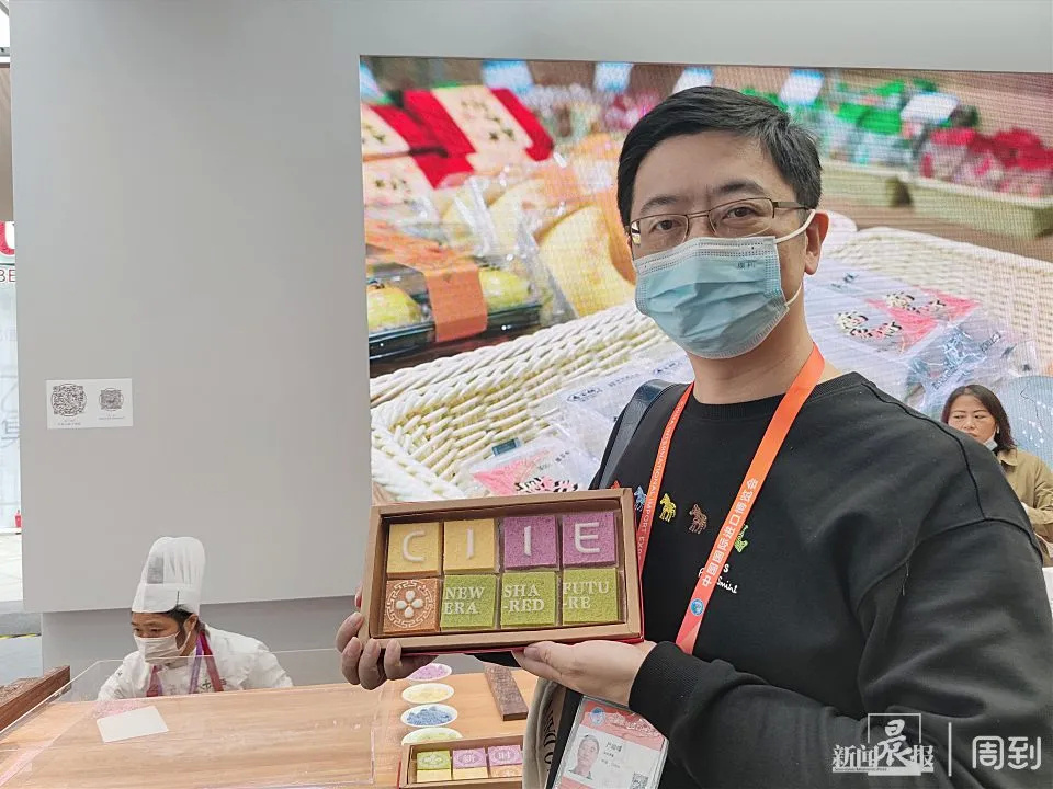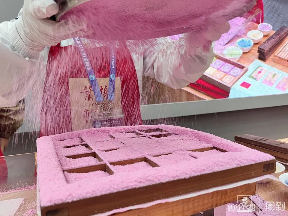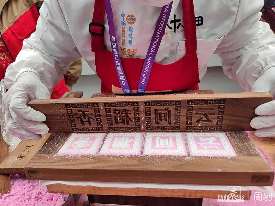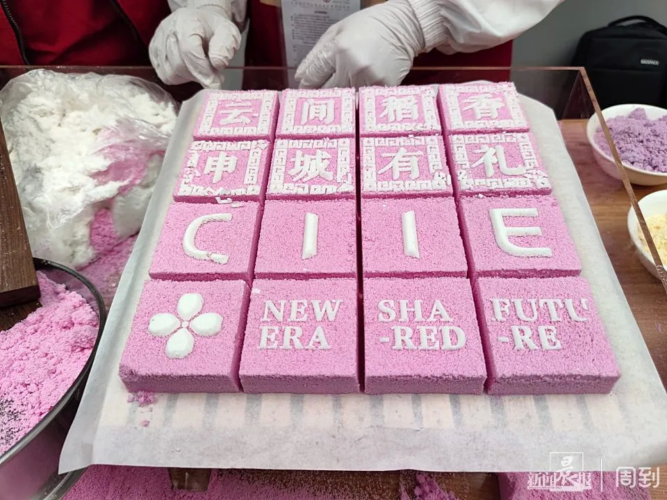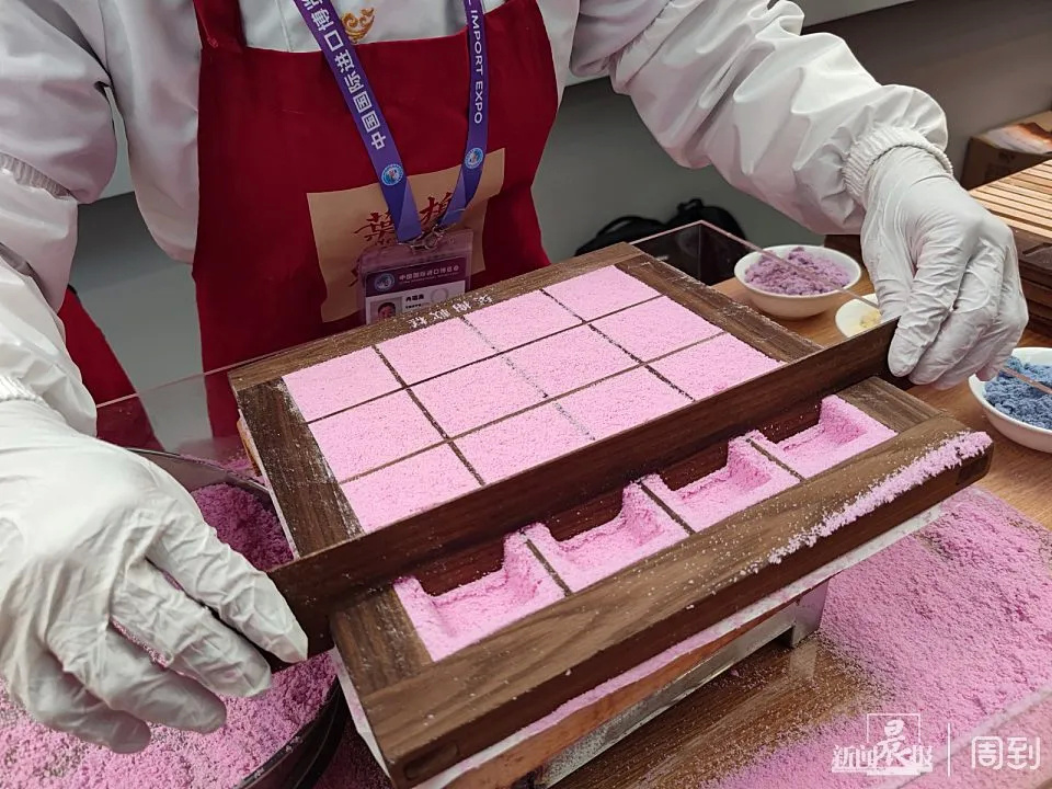 师傅在现场演示了叶榭软糕制作技艺当中的筛粉,嵌料,制糕等过程,并做出了带有CIIE字样的进博主题软糕。记者发现,经过传承创新之后的叶榭软糕,在加上活字印刷的呈现形式之后,色彩之缤纷,让人爱不释手。