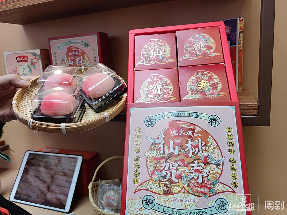 这次进博会,沈大成携今年新款仙桃贺寿礼盒,以及秋收礼盒、 重阳糕、定胜糕、双酿团等众多经典系列亮相。据现场工作人员介绍,沈大成原来的寿桃只能当天食用,经过创新,新款“仙桃”保质期延长到了三十天,“仙桃”当中还加入了白桃果肉,除了外包装设计新颖,这个礼盒装还搭配(随盒赠送)了一个泉州窑烧制的小瓷器,非常富有传统文化内涵。
