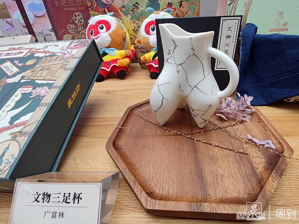 位于松江的广富林文化遗址,享有“上海之根”的美誉,也是目前经考古发现的上海29处遗址中内容丰富、极具保护与开发价值的古文化遗址。广富林遗址中,留存最多的是各种碎陶残瓦,而陶器往往是展现远古文明的载体。在展区,记者看到一款“广富林文物三足杯”,选取出土的广富林时期标志性三足陶罐形态,增添了历史、文化和趣味性。