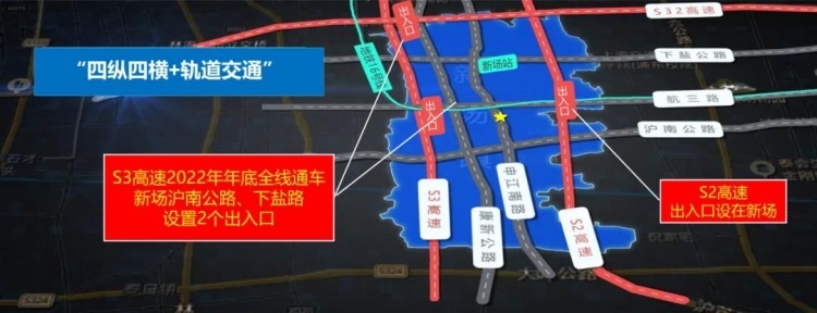 新场战略区位与交通优势显著。从战略区位上看,新场位于浦东中部乡村振兴示范带和“南北科技创新走廊”交汇点。交通上,有着“四纵四横+轨道交通”的路网结构;轨道交通16号线、申江路与市中心便捷联系;S2高速沪南公路出入口设在新场;S3高速明年年底全线通车。