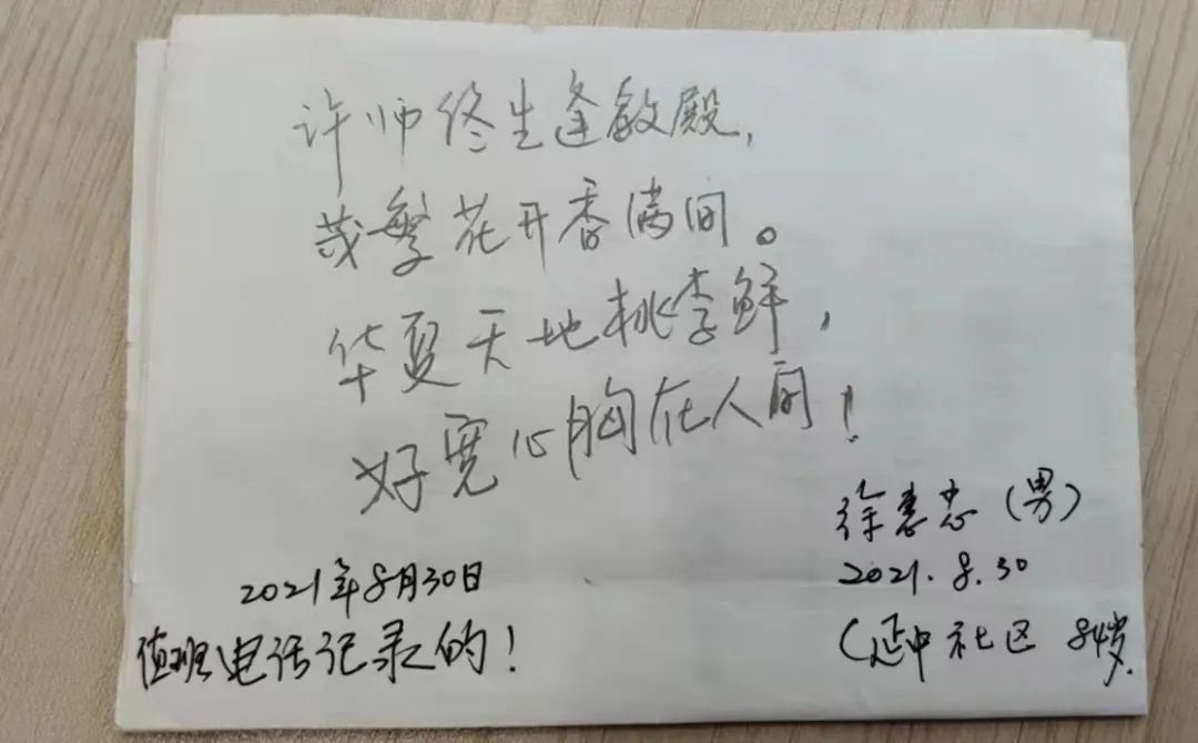 随着一次次深入交流,许阿婆知晓原来徐老伯是我国航天研发重要贡献者,曾参与亚洲卫星一号发射工作,获得国防科学技术二等奖。自此,许阿婆在每次电话问候前,都会查找资料,学习航天知识,只为找到能重新激发徐老伯兴趣的话题。为了表达对许阿婆的感谢之情,徐老伯在今年教师节之际特意写了一首藏头诗: