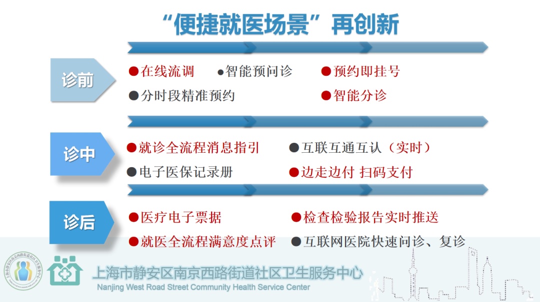 中心深入推进家庭医生制签约服务,积极探索预约制就诊的分级诊疗服务,率先开展互联网社区医院、先行先试功能社区服务模式,从诊前、诊中、诊后就医全流程细分考虑,对“便捷就医场景”再创新。中心还是首批与上海华山医院、静安区中心医院建立区域医疗联合体的社区卫生服务中心之一,创新全专联合门诊的形式,将二、三级医院优质医疗资源下沉到社区。同时,在老年护理病房,中心主动引入华东医院、上海市第四康复医院的优质医疗资源,打造康复医联体。