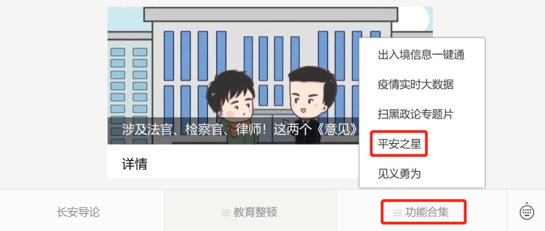 进入会话框,点击底部“功能合集”中的“平安之星”栏目,即可得到投票链接图文,点击图文进入投票页面。